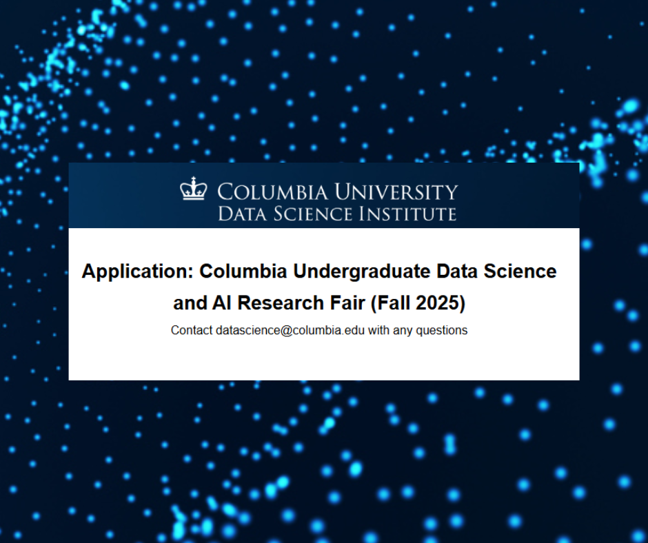 The fair will be held on Thursday, November 6 from 5:00 PM - 7:30 PM in Carleton Commons, Mudd Building. The event is hosted by the Data, Media, and Society Center at the Data Science Institute, co-organized by a committee of undergraduate students across Columbia University and Barnard College, and co-sponsored by schools and units across our campus. The event is free and open to all to register and attend.