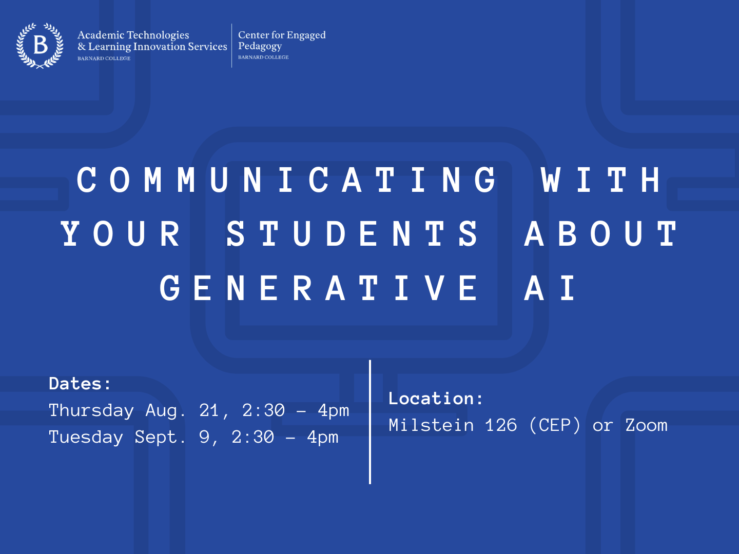 ATLIS and CEP invite faculty and teaching staff to a workshop on strategies and practices for communicating with your students about generative AI. After a brief primer on concepts and principles for major AI tools (e.g., AI detection, AI note-taking), instructors will engage in a discussion to gauge their level of AI literacy. Participants will then work in smaller groups to craft a clear AI course policy (if applicable) OR articulate a plan for integrating genAI within an assignment. Finally, we’ll apply some of this knowledge and some of these strategies to classroom scenarios to help you prepare for concerns or questions around the use of generative AI that may come up in your course. You can RSVP here.