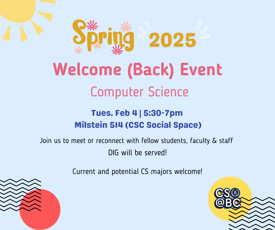 Join us on Tuesday, February 4 from 5:30 p.m. to 7:00 p.m. to meet or reconnect with fellow students, faculty, and staff. Current and prospective CS majors and minors, as well as students generally interested in learning more about CS at Barnard, are invited to join us in conversation and community. We will be gathering in the Milstein 514 (CSC Social Space). DIG will be served!