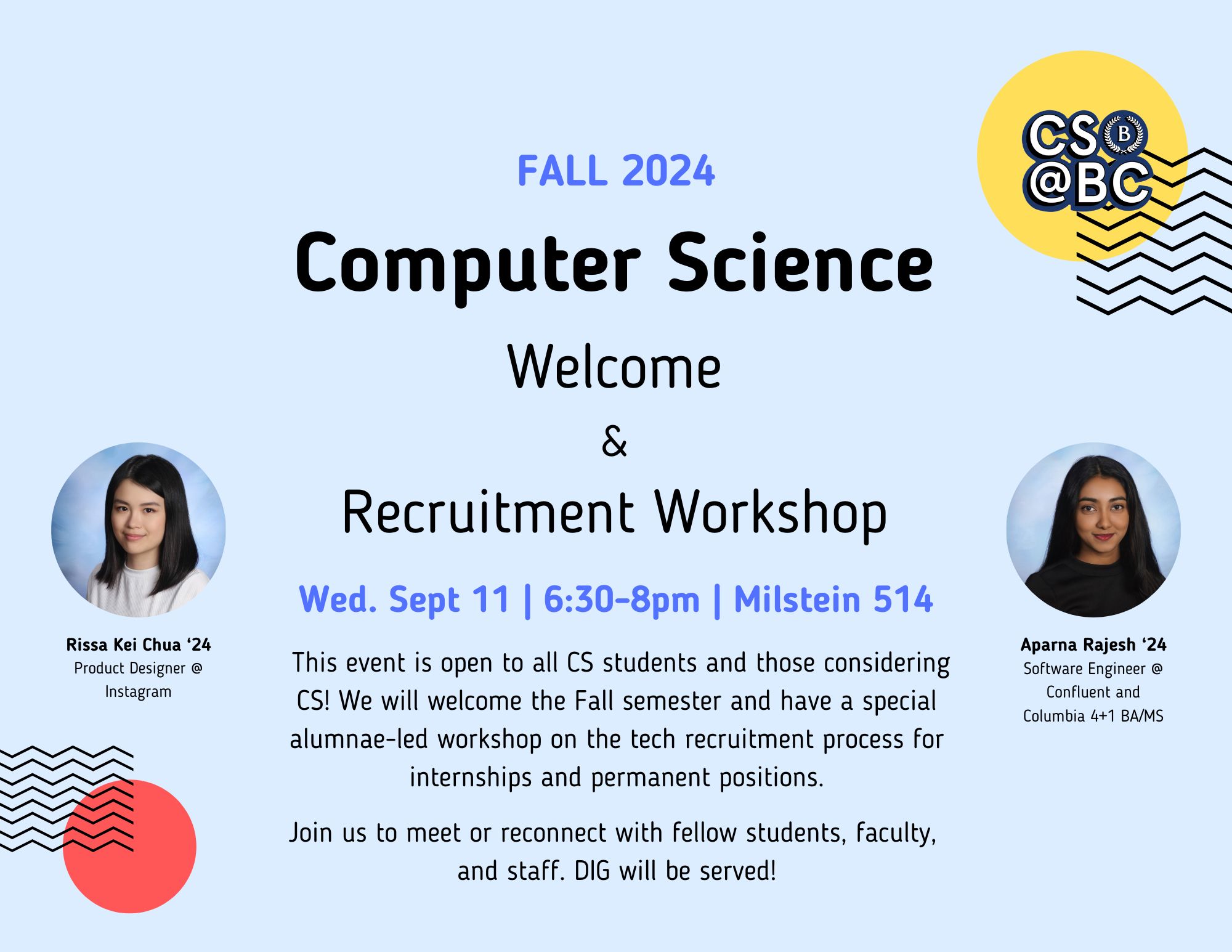 This event is open to all CS students and those considering CS! We will welcome the Fall semester and have a special alumnae-led workshop on the tech recruitment process for internships and permanent positions.