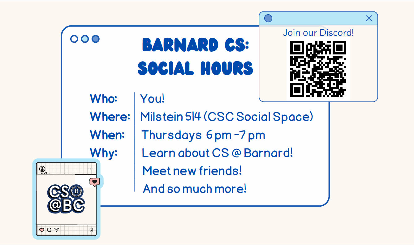 Then come by our CS Social Hour, which takes place on Thursdays throughout the semester. We will be gathering in the CSC Social Space on the 5th Floor of Milstein.Image removed.