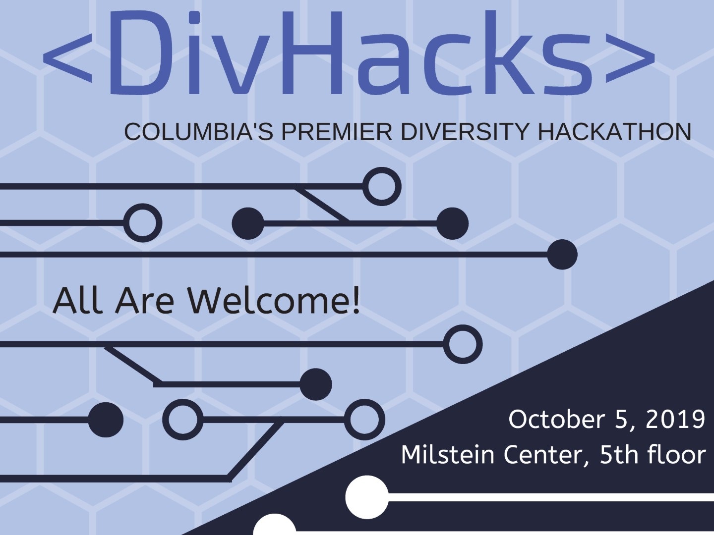 Computer Science at Barnard and the Vagelos Computational Science Center, in collaboration with Columbia University Womxn in Computer Science, are hosting DivHacks on October 5th from 8 am to 9 pm at Barnard College in the Milstein Center. DivHacks is Columbia's premier diversity hackathon with an objective to create an empowering and inspirational space for underrepresented students in entrepreneurship and technology. For too long, the technology sector has prioritized the voices of the privileged at the expense of diverse peoples and points of view.
