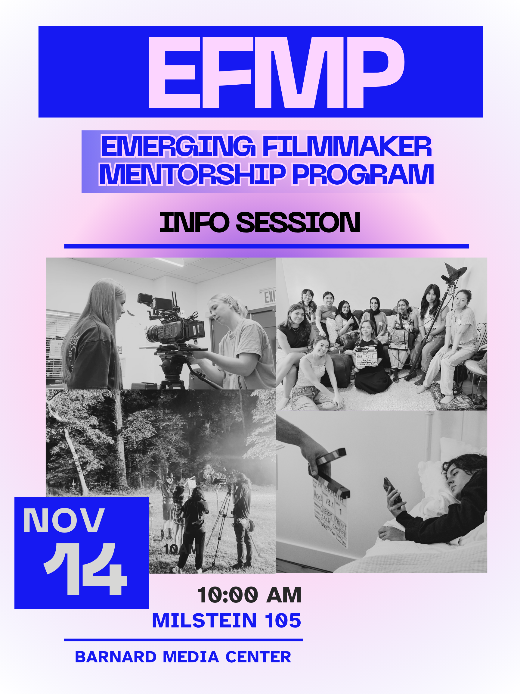 Join us for an information session on the Emerging Filmmaker Mentorship Program (EFMP). EFMP supports Barnard students with mentorship, advanced equipment and funding to create a short film.