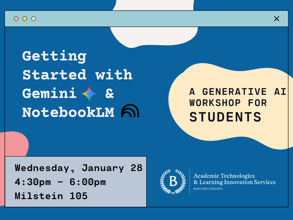 This workshop will introduce Gemini and NotebookLM, two generative AI tools from Google that the Barnard community has access to. After an overview of their features, participants will have time to try these tools for themselves. We will discuss potential use cases related to learning and research that are in alignment with Barnard’s academic policies, as well as extracurricular uses for these tools. Sign up here.