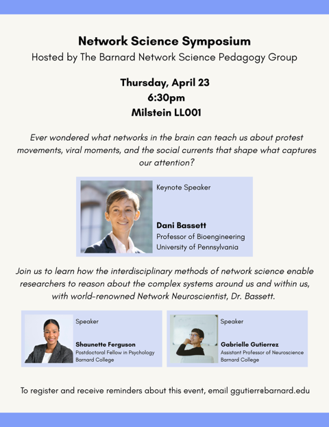 The Barnard Network Science Pedagogy Group is happy to announce its Network Science symposium with keynote speaker, Dani Bassett, at the end of this semester. Please join us!